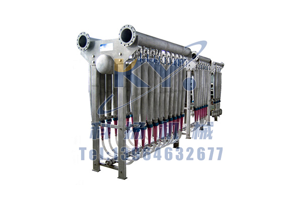 该除渣器由上下两个锥形部组成,纸浆在高压下由上部进浆口沿切线方向进入除渣器,沿锥体作螺旋运动形成涡旋,纸浆中的重杂质在离心力及自身重力的作用下,被分离出并沿着锥形内壁从上锥形部向下锥形部下降,良浆由涡旋产生的中心负压区上行从顶部的出浆口排出;重杂质及部分纤维下沉至下锥体,下锥部装有压力进水管,通入压力水,在冲洗水作用下进行反冲洗涤进一步稀释浆渣,使纤维与杂质分离,并且纤维上浮,重杂质经下锥体出渣口下沉至沉渣桶内。沉渣桶上设有给水口及视窗,供清洗、观察,以便及时排渣。
